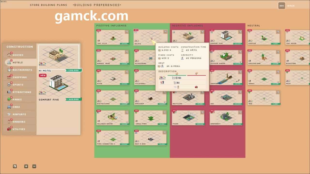 ,如果您没有足够的资金来开发基础设施,则可以借钱。每年,都会显示支出和利润的报告。参与广告,使您能够吸引更多的游客。您可以雇用专家和顾问,他们将帮助您选择正确的策略。还可以使用卡片编辑器,它使您可以创建一个独特的度假胜地,该度假村不会限制您的资源。