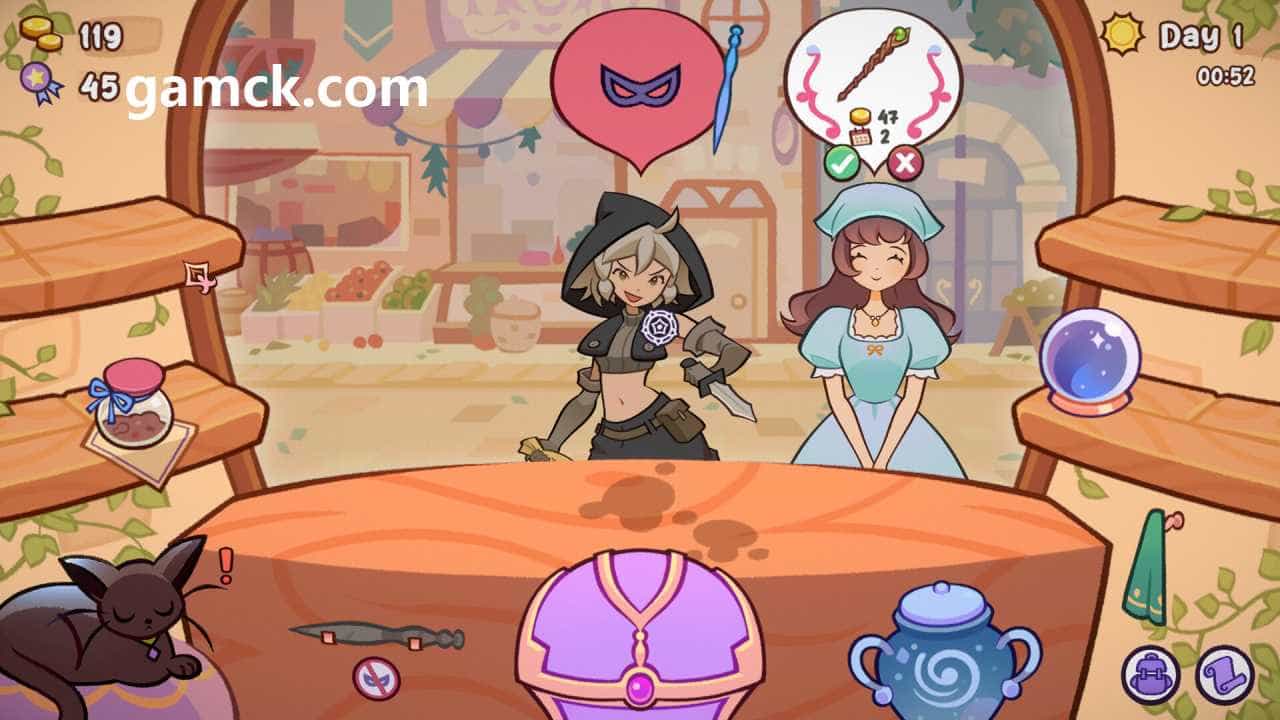 Witchy Business 建议领导自己的女巫商店。主要任务是为不断的客户流动药水。日常事务包括实施特殊订单,魔法物品的制造以及其企业的发展。也有必要应对麻烦,例如,在试图窃取硬币的小偷上应用咒语。最终的目标是成功管理机构并实现其繁荣,这要归功于优质的服务和调试的生产。