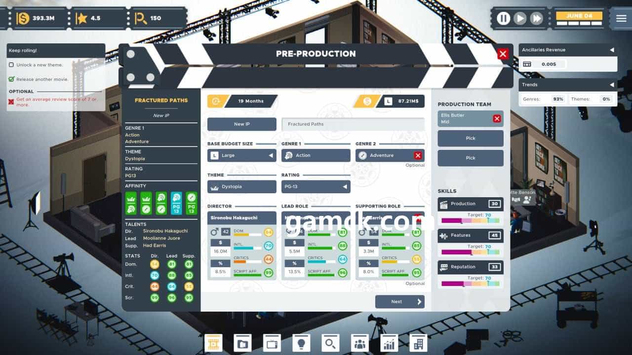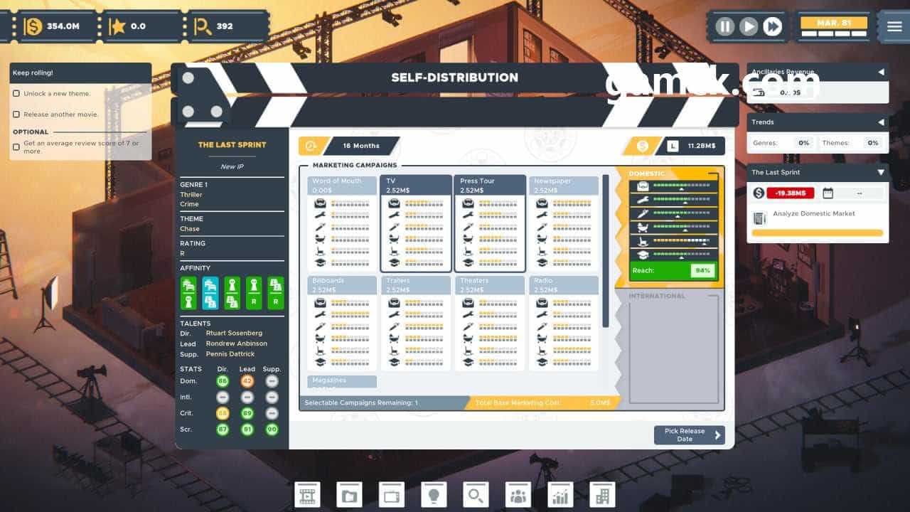 执行 – 电影界大亨还探索了分销的困难。用户应决定他们是将自己的电影独立出版还是与分销商合作,并且每条路径都提供各种奖励和风险。电影退出时间的选择同样重要,游戏玩家应监控市场趋势和竞争。
