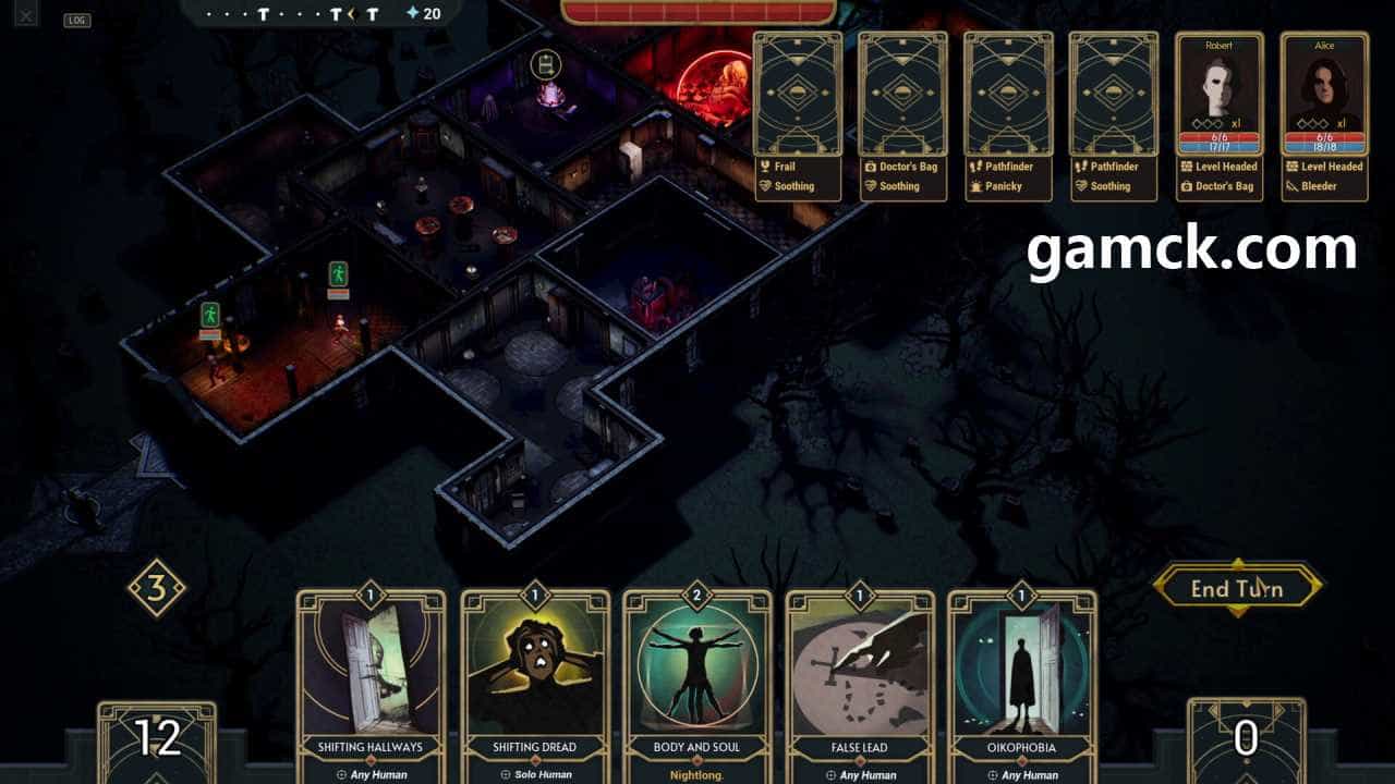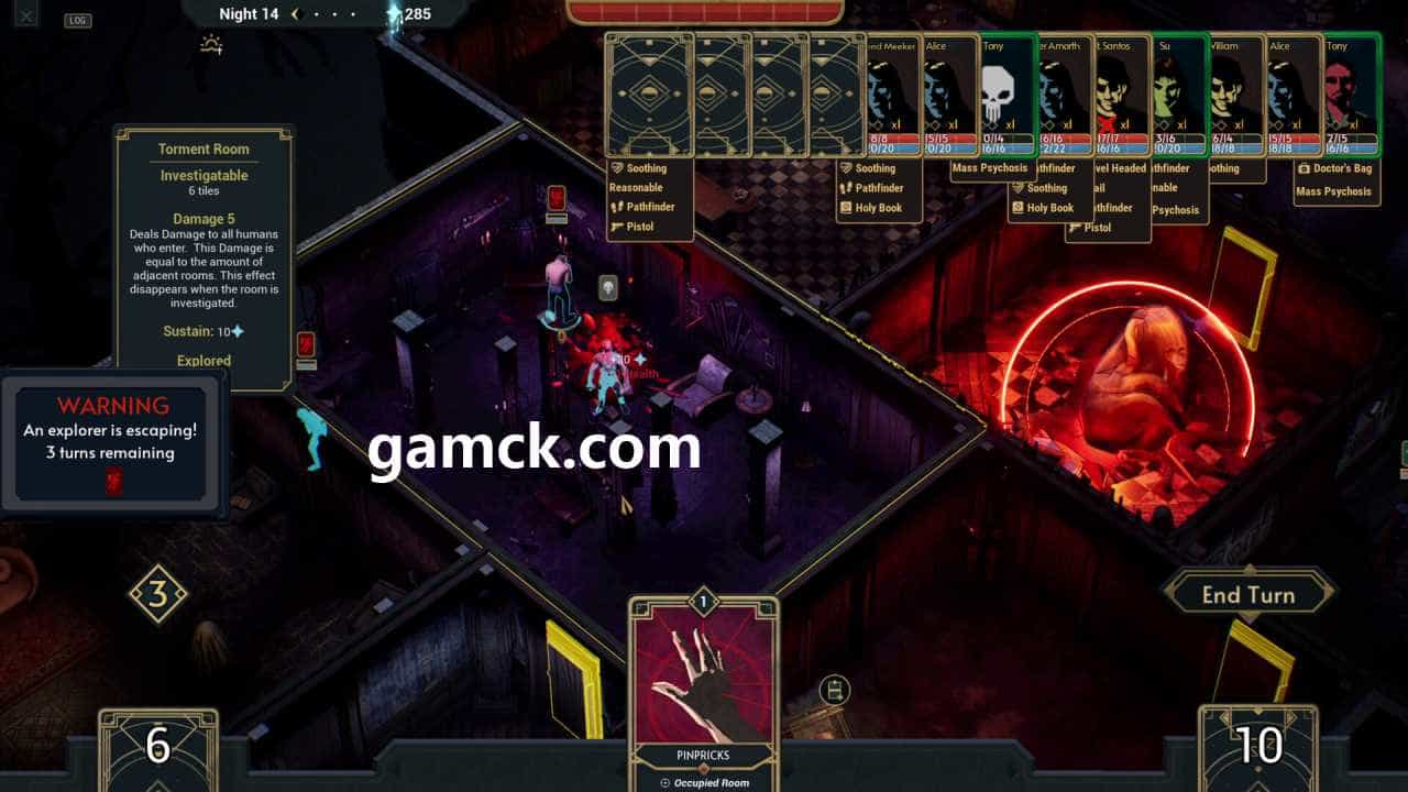 完成准备工作,房屋引诱了里面的冒险者,在那里有必要使用甲板上的卡片。这些卡激活了各种事件:突然出现,令人恐惧的声音或走廊情况的变化。在此阶段的主要任务是不断增加对受害者的心理压力,使他们发疯,同时保护豪宅,心脏房,心脏室,免受检测或破坏的脆弱中心。成功的消除或引起人们的精神错乱带来了必要的能源资源,这将扩大结构本身并增加其不良的荣耀,从而吸引新的目标。