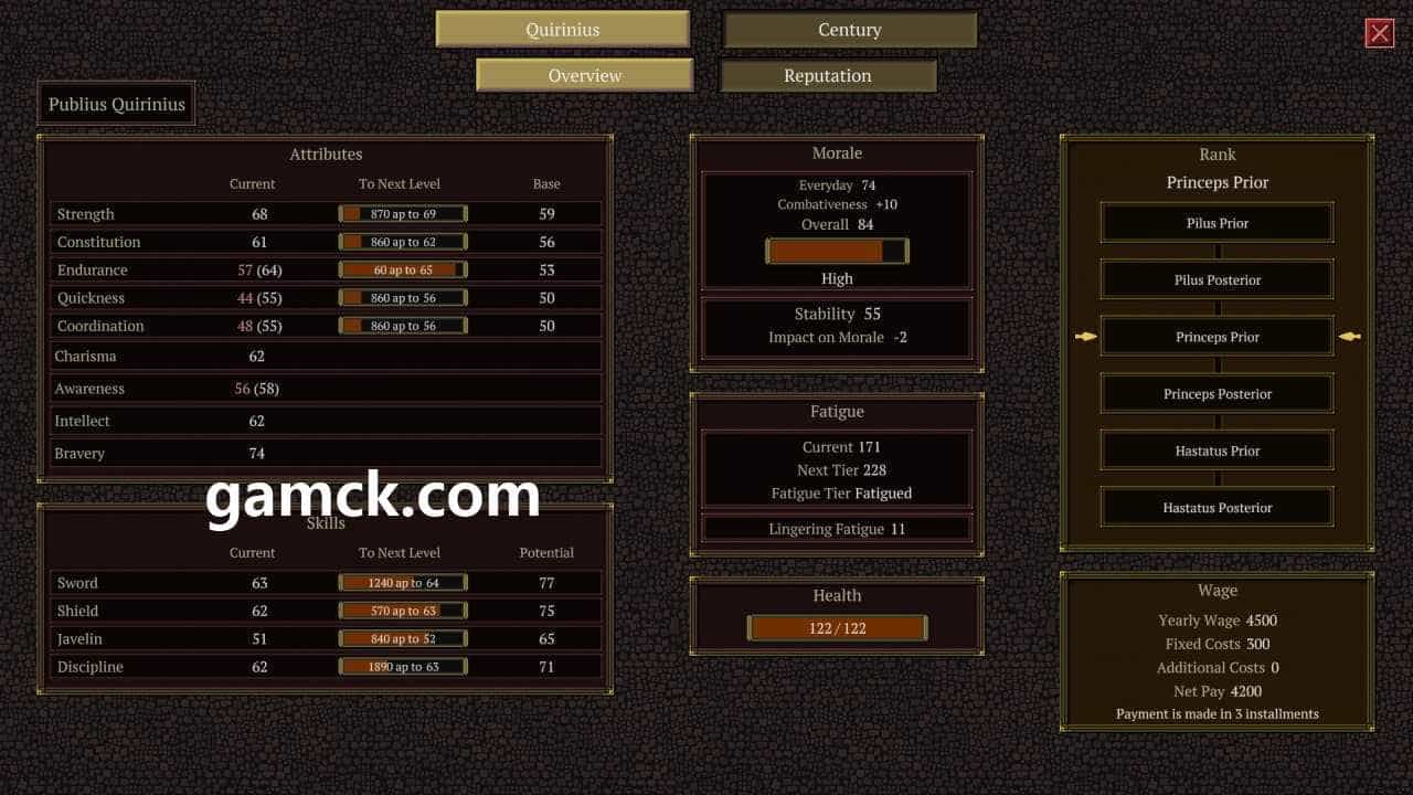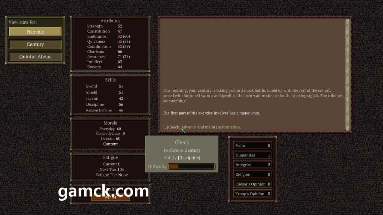 游戏充满了历史细节,其中包含文本事件和叙事选项。在整个游戏中都检查了角色的技能和素质,这确保了这一过程中的深层沉浸。每个动作或选择都有其自身的后果,确定情节的过程。要求对历史可靠性的这种关注,以使用户有机会感受这个动荡时期的罗马军官的生活。